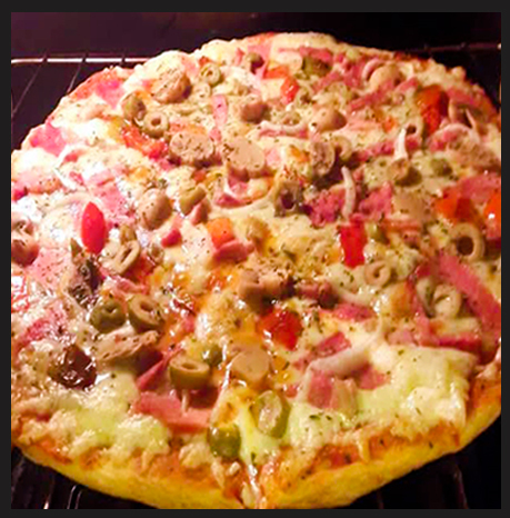 Pizzerino (La Original) — Jamón de pierna, tocino, champiñones, pimiento, aceitunas verdes, + mozzarella. y cebolla blanca. ¡La que todos piden!